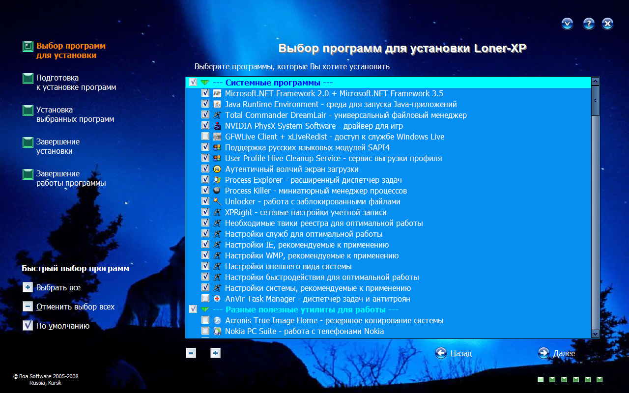 - возможность выбора программ и драйверов в процессе установки;