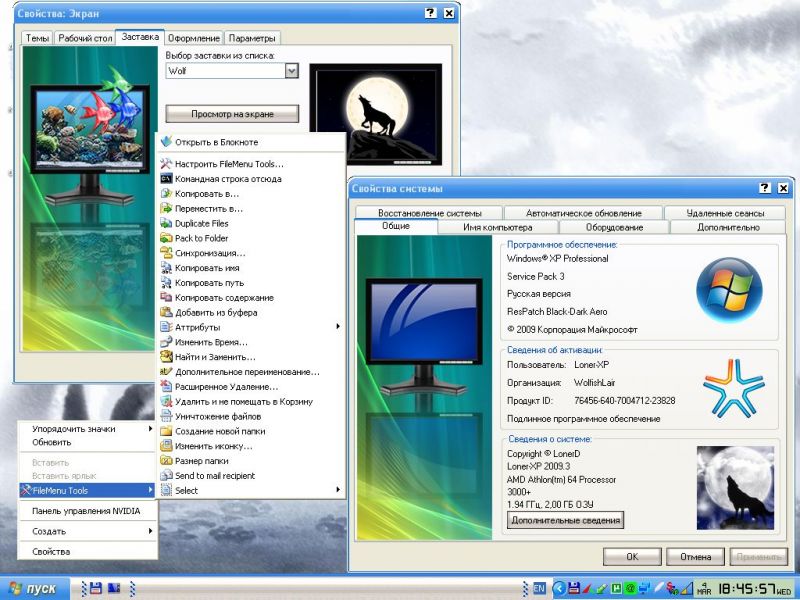 По умолчанию ставится тема оформления Corona, звуковая схема Vista, курсоры Windows Aero и волчий скринсейвер