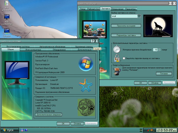 По умолчанию ставится тема оформления BlackBlue, звуковая схема Windows7, курсоры Windows Aero и волчий скринсейвер